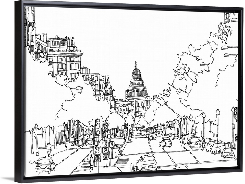 <p>Black and white cityscape illustration of Washington DC.</p>