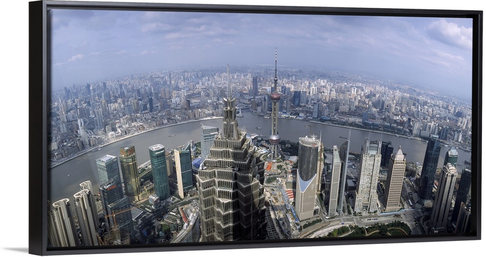 <p>Landscape, high angle photograph of many buildings in the district of Pudong, Shanghai, the Huangpu River runs through, beneath a hazy blue sky in China.</p>