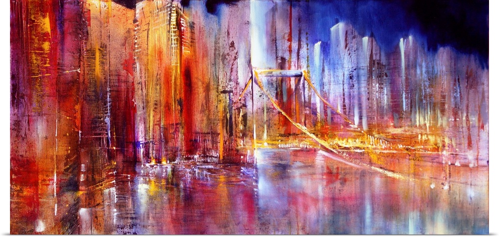 <p>Abstractly painted cityscape in bright colors and structures: on the way on a suspension bridge, in the background a large, lively city with the silhouette of skyscrapers in red and blue. Reflection in the water.</p>