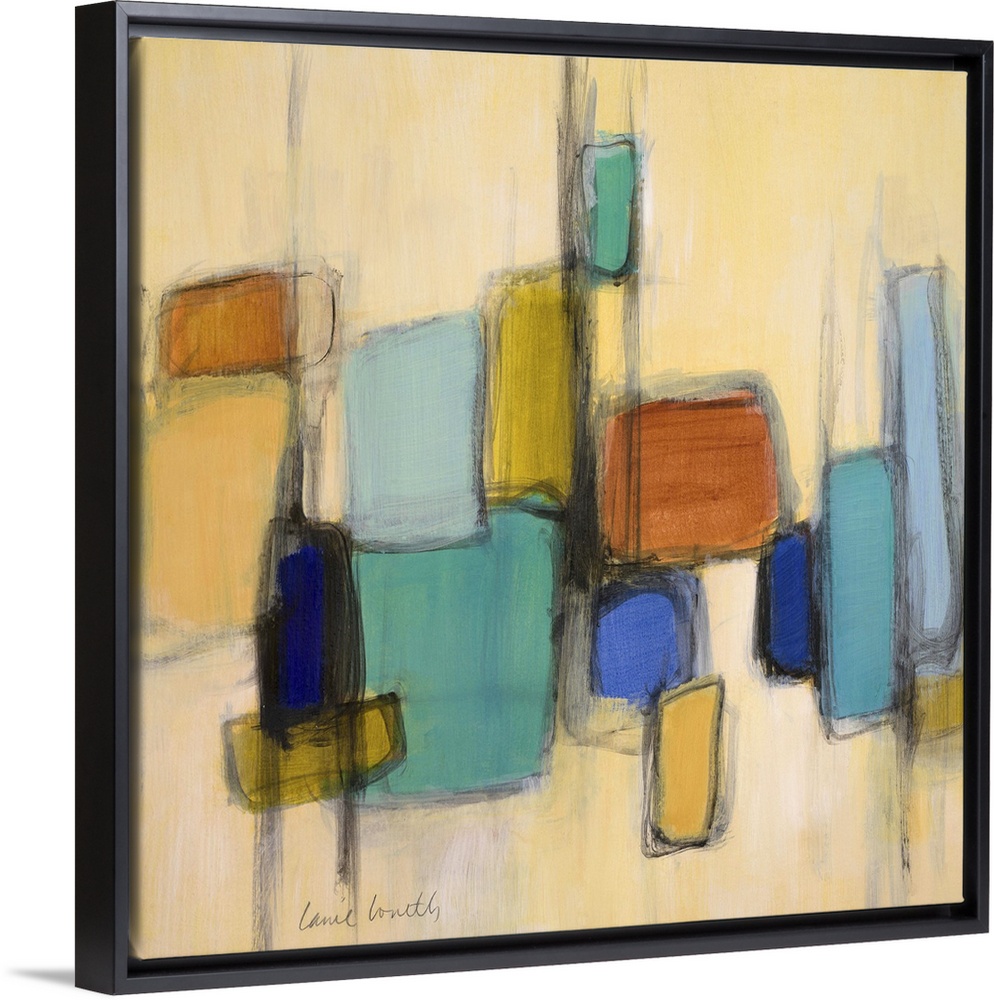 <p>Contemporary abstract art using bold dark lines and colorful geometric shapes against a cream background.</p>