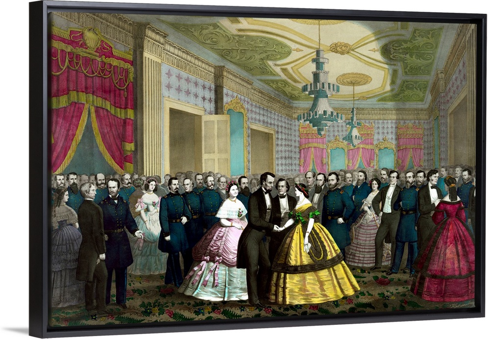 <p>Vintage Civil War era color print of President Abraham Lincoln and Mary Todd Lincoln during their last reception at the White House. Other notable figures are General William Tecumseh Sherman, Andrew Johnson, and General Ulysses S. Grant.</p>