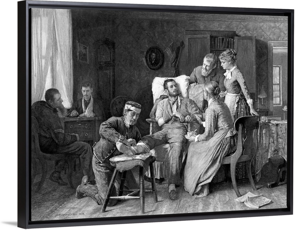 <p>This vintage Civil War poster features a wounded Union soldier, during the Battle of Gettysburg, being tended to in a home.</p>