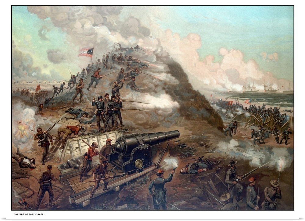 <p>Civil War print depicting the Union Army's capture of Fort Fisher. The capture of Fort Fisher was a joint assault of Union Army and Naval forces. Fort Fisher was refer to as the Gibraltar of the South and was the last major coastal stronghold of the Confederacy. The battle took place January 13 - 15, 1865 outside of Wilmington, North Carolina.</p>