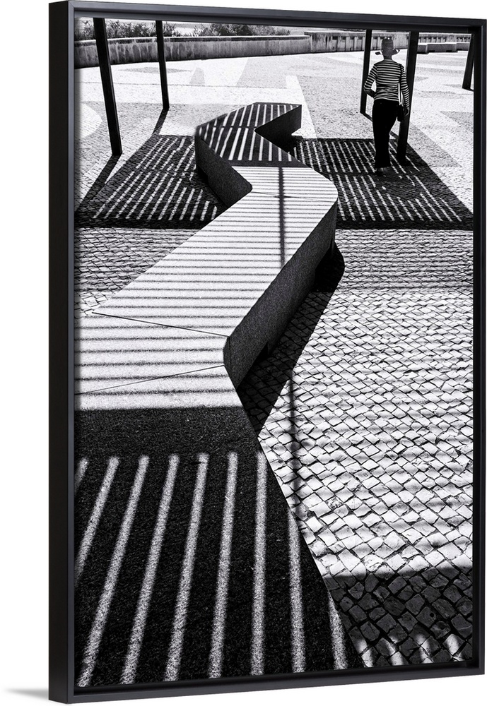 <p>A person wearing a striped shirt mimics the stripes of the shadows on the ground around them.</p>