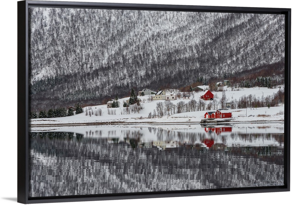 <p>Small village with bright red houses on the shore of a smooth lake reflecting everything around.</p>