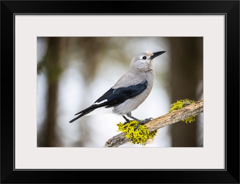 <p>Clark's Nutcracker (Nucifraga columbiana) perched on branch with colourful lichens; Silver Gate, Montana, United States of America</p>