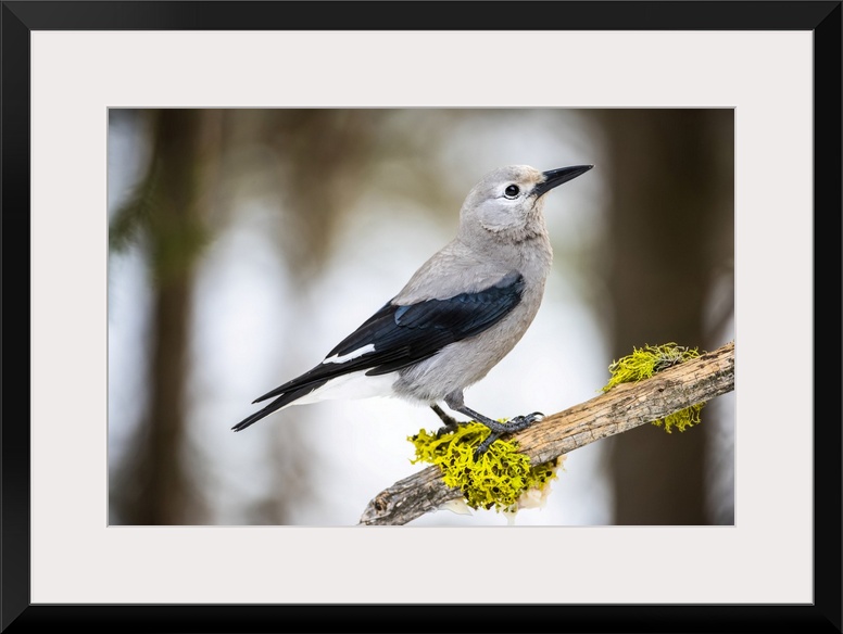 <p>Clark's Nutcracker (Nucifraga columbiana) perched on branch with colourful lichens; Silver Gate, Montana, United States of America</p>