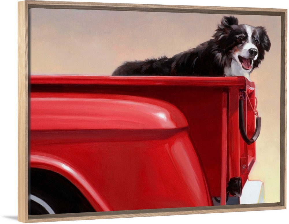 <p>Painting on canvas of a dog standing in the back of an old truck bed.</p>