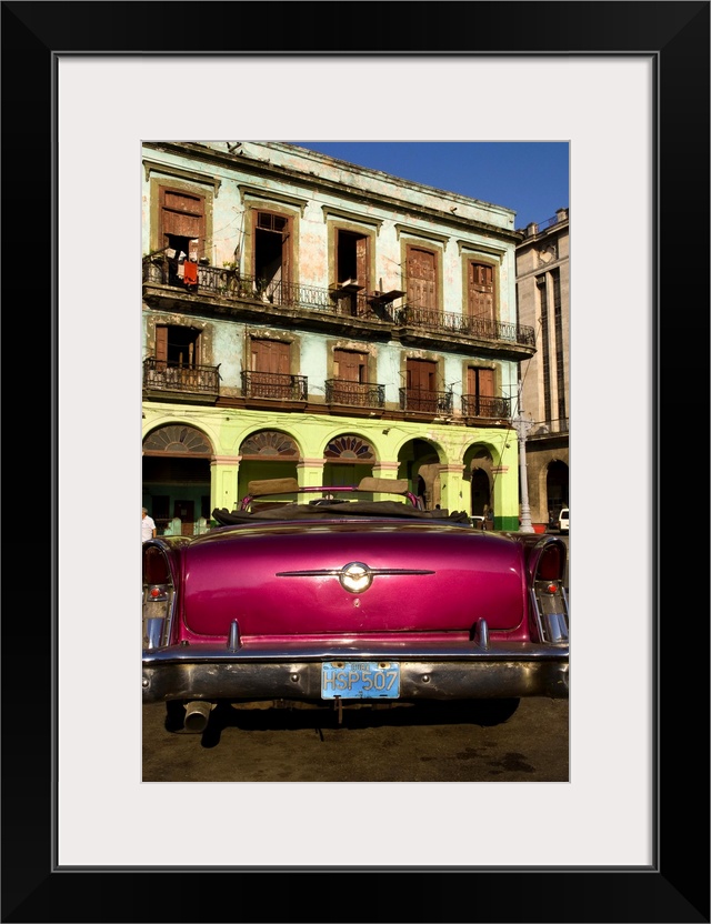 <p>Classic 50s Buick colorful convertible auto in Havana Cuba Habana in front of old worn and colorful apartment buildings in downtown city</p>