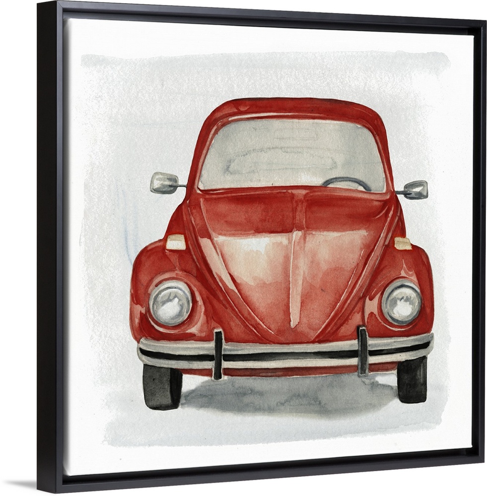 <p>Decorative artwork of a classic red Volkswagen Beetle on gray and white backdrop.</p>