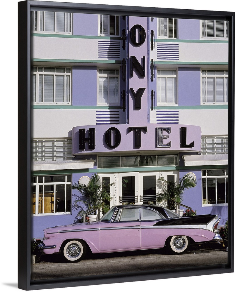 <p>Vertical photograph on a large wall hanging of an old, classic car parked beneath the sign for the Colony Hotel, along Miami Beach, in Florida.</p>