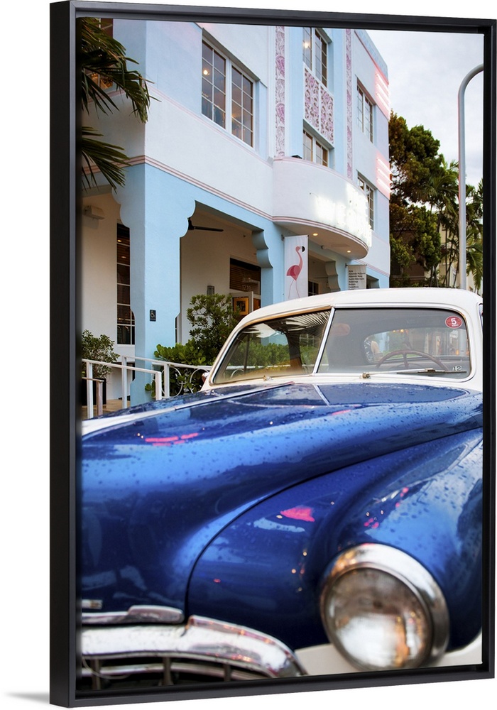 <p>Photograph of a classic car in Miami, Florida, by an art deco style building.</p>