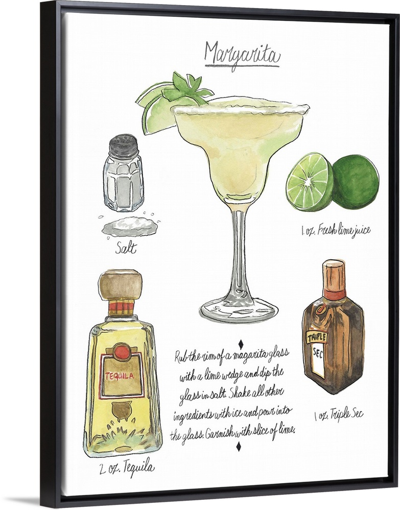 <p>Contemporary artwork of a cocktail recipe showing illustrated ingredients against a white background.</p>