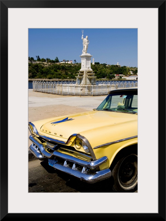 <p>Classic Dodge 50s auto in front of river and statues with Christ statue on hill in background in Havana Cuba Habana</p>