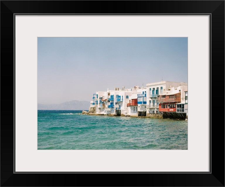 <p>Photograph of white buildings with colorful balconies overlooking the water in Mykonos, Greece.</p>