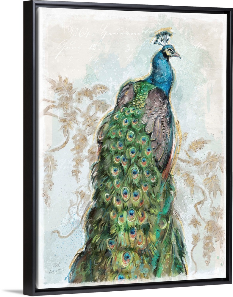 <p>The elegant peacock shows its plumage in this stunning depiction.</p>