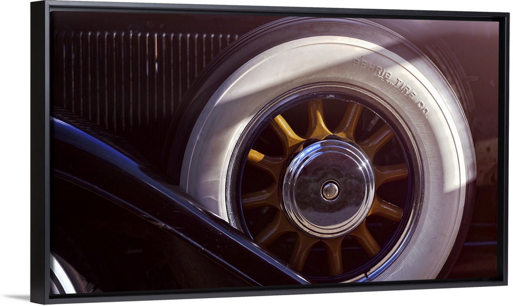 <p>Close Up View of a Woddeen Spoked Spare Wheel with Whitewall Tires of an Antique Automobile</p>