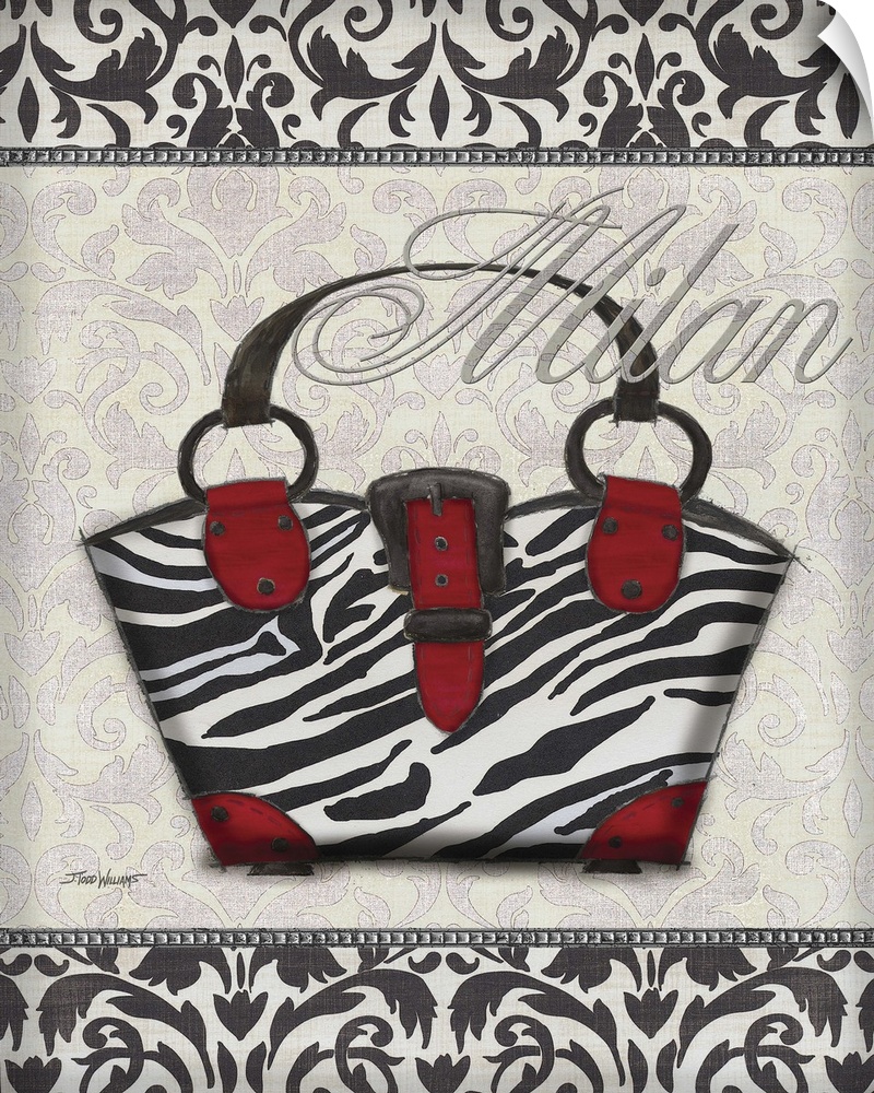 <p>Black, white, and red decor with an illustration of a zebra print purse and "Milan" written on top in silver.</p>