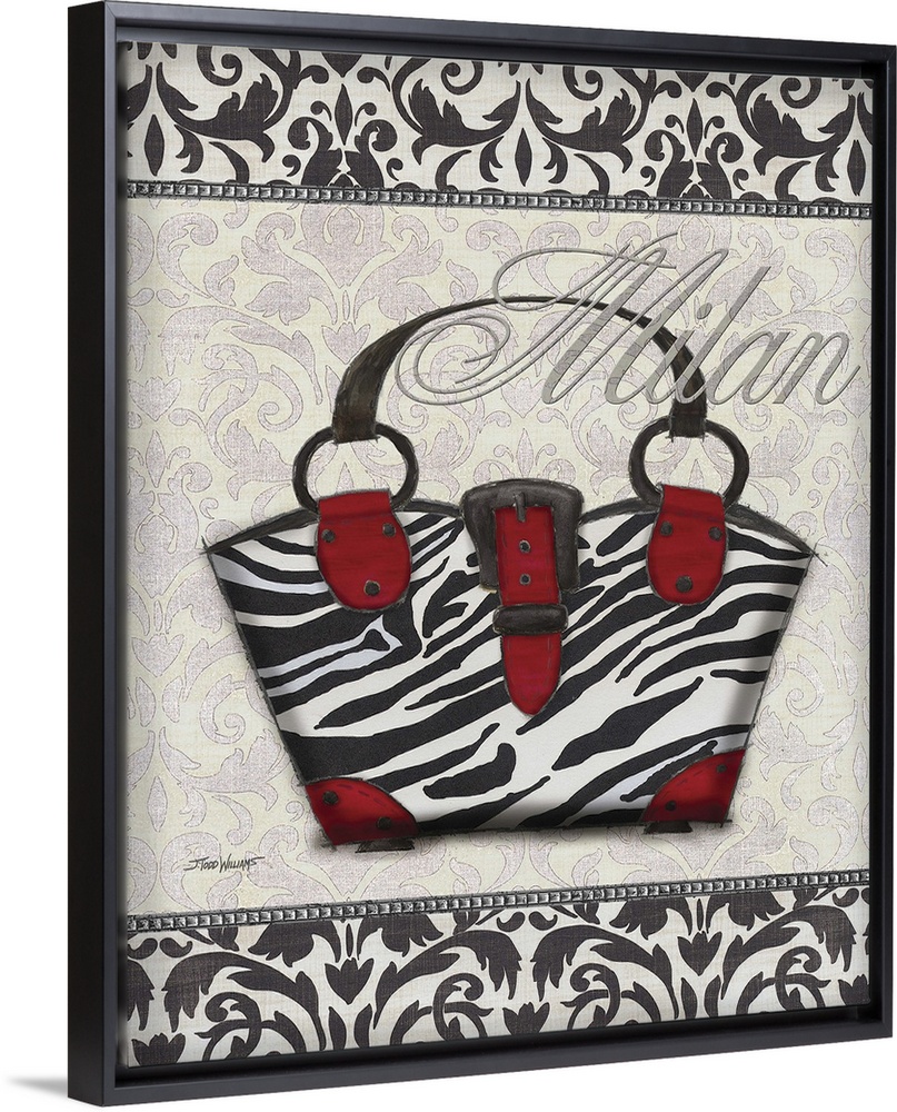 <p>Black, white, and red decor with an illustration of a zebra print purse and "Milan" written on top in silver.</p>