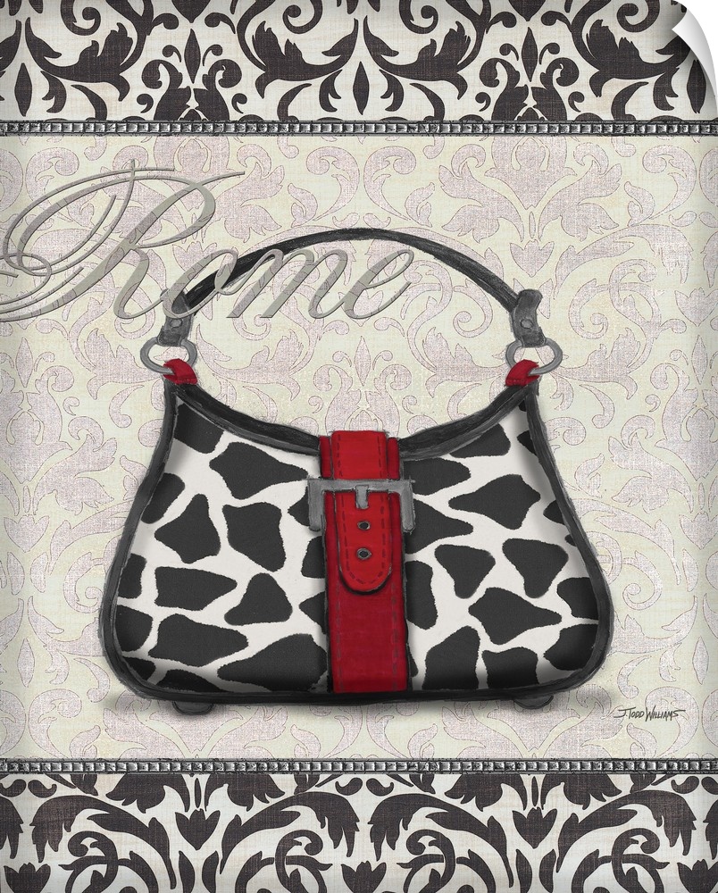 <p>Black, white, and red decor with an illustration of a giraffe print purse and "Rome" written on top in silver.</p>