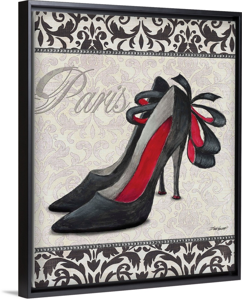 <p>Black, white, and red decor with an illustration of a pair of high heel shoes with "Paris" written on top in silver.</p>