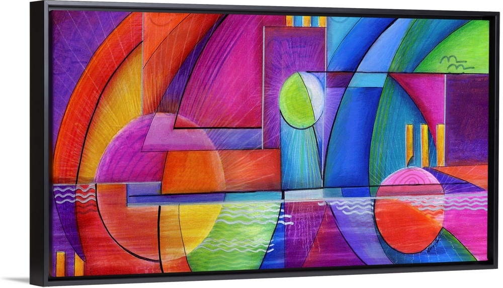 <p>Horizontal abstract painting of vibrant colored shapes in circles and triangles.</p>