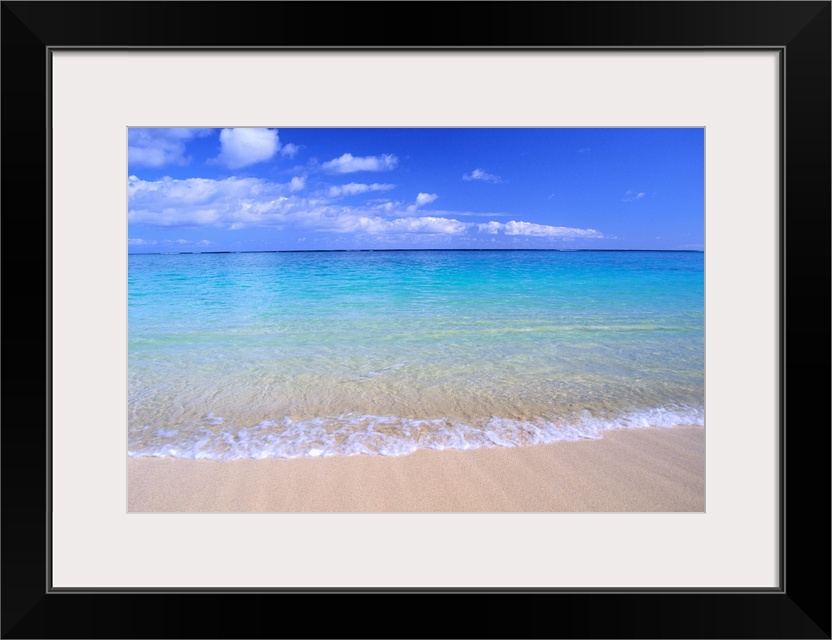 <p>This home docor features a photograph that is a horizontal seascape of clean ocean water washing up on a sandy beach.</p>