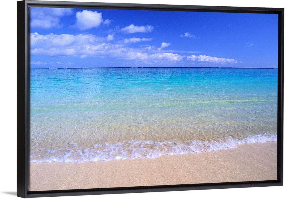 <p>This home docor features a photograph that is a horizontal seascape of clean ocean water washing up on a sandy beach.</p>