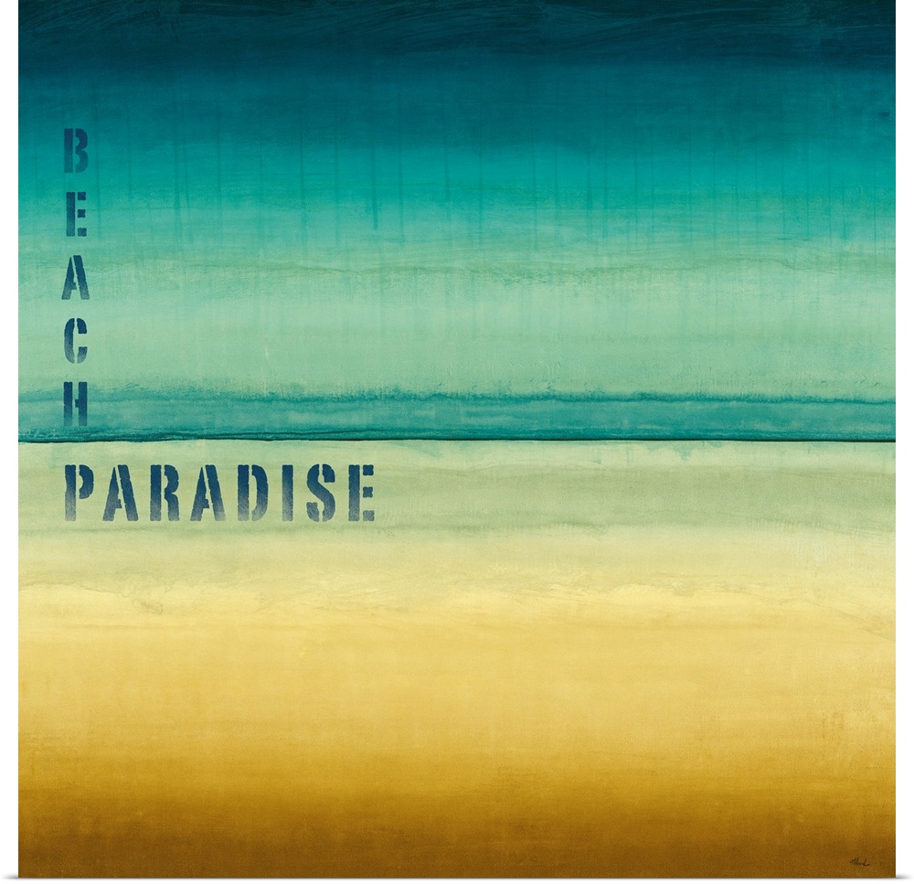 <p>Abstract artwork of a beach scene with the blue sky colors that appear to be dripping down from above and the words ""Beach Paradise"" going vertically and horizontally on the left side.</p>