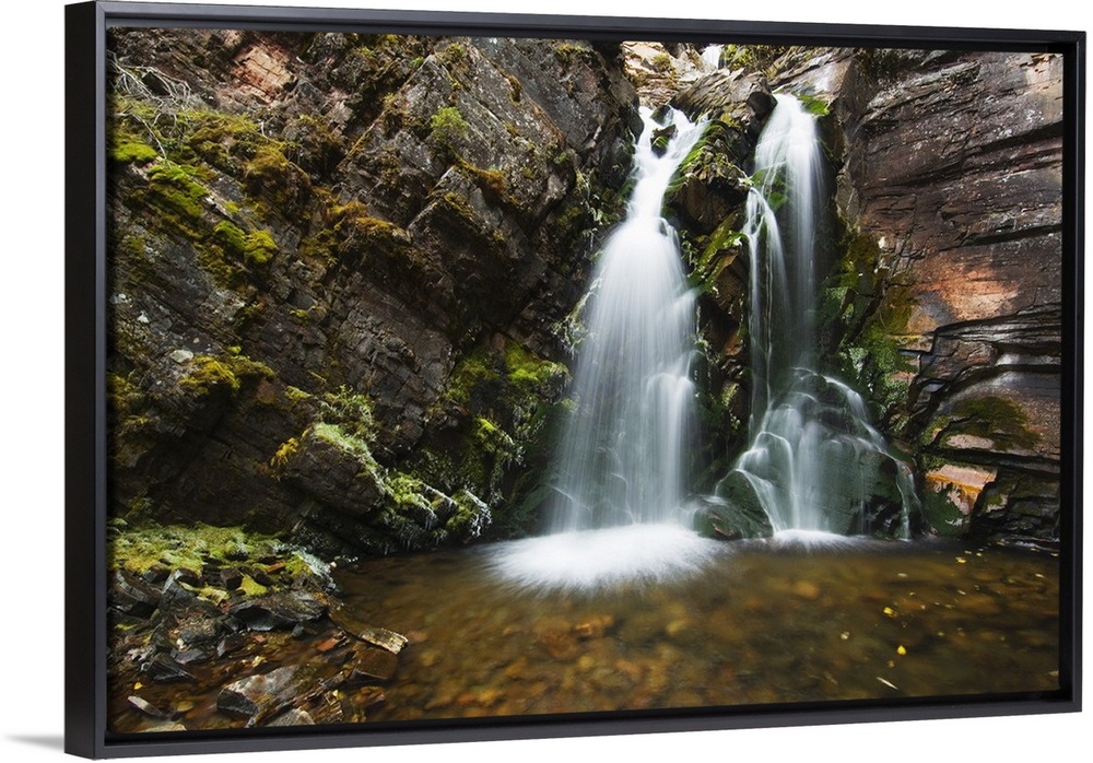 <p>Photo on canvas of water falling from a rocky cliff into a pool of water in Montana.</p>