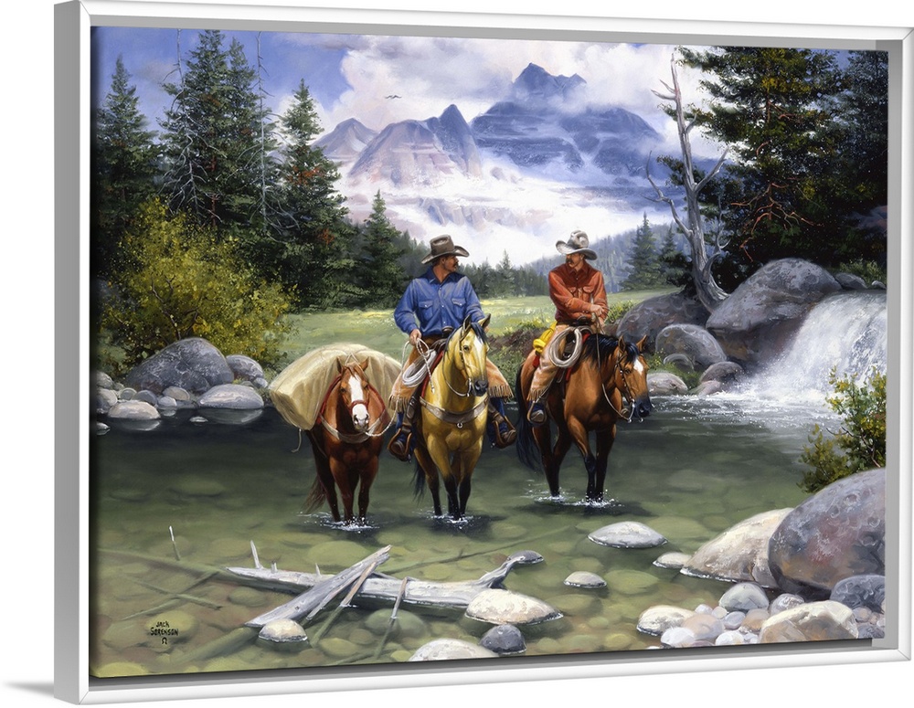 <p>Contemporary Western artwork of two cowboys and their horses crossing a mountain stream,</p>