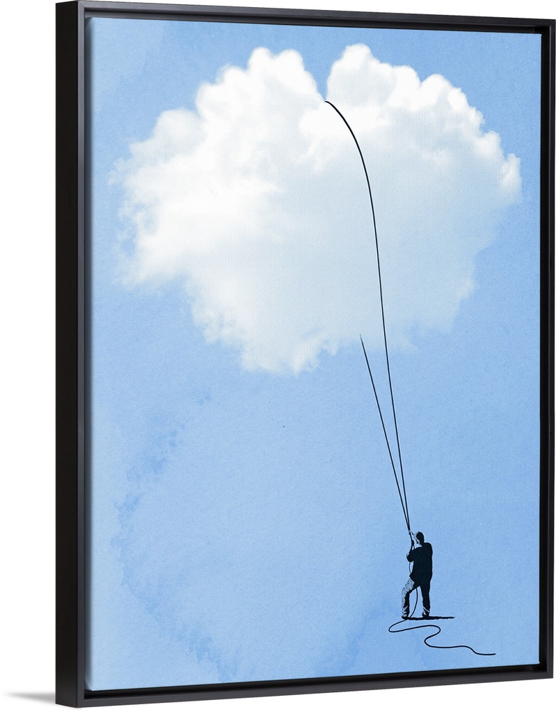<p>Tall canvas of the silhouette of a man pulling on a rope that he has wrapped around a cloud.</p>