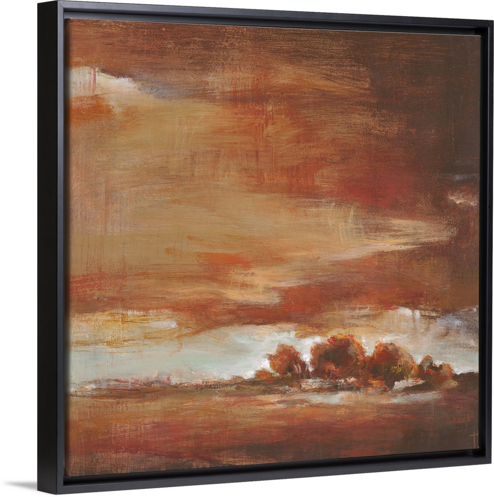 <p>Contemporary landscape painting in autumn colors under a red sky.</p>