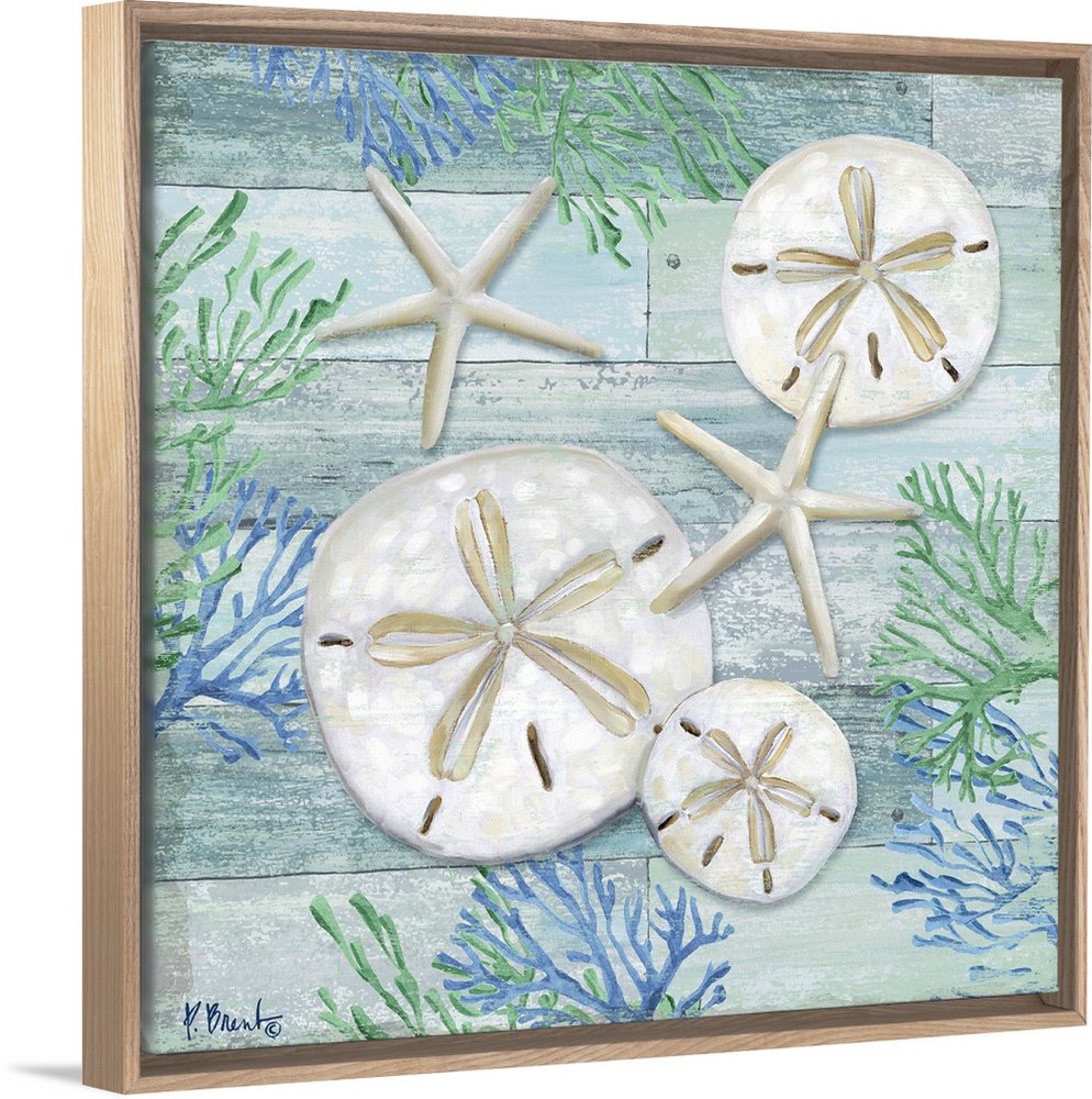 <p>Square sand dollar, starfish and coral decor in light blue, green, and white.</p>