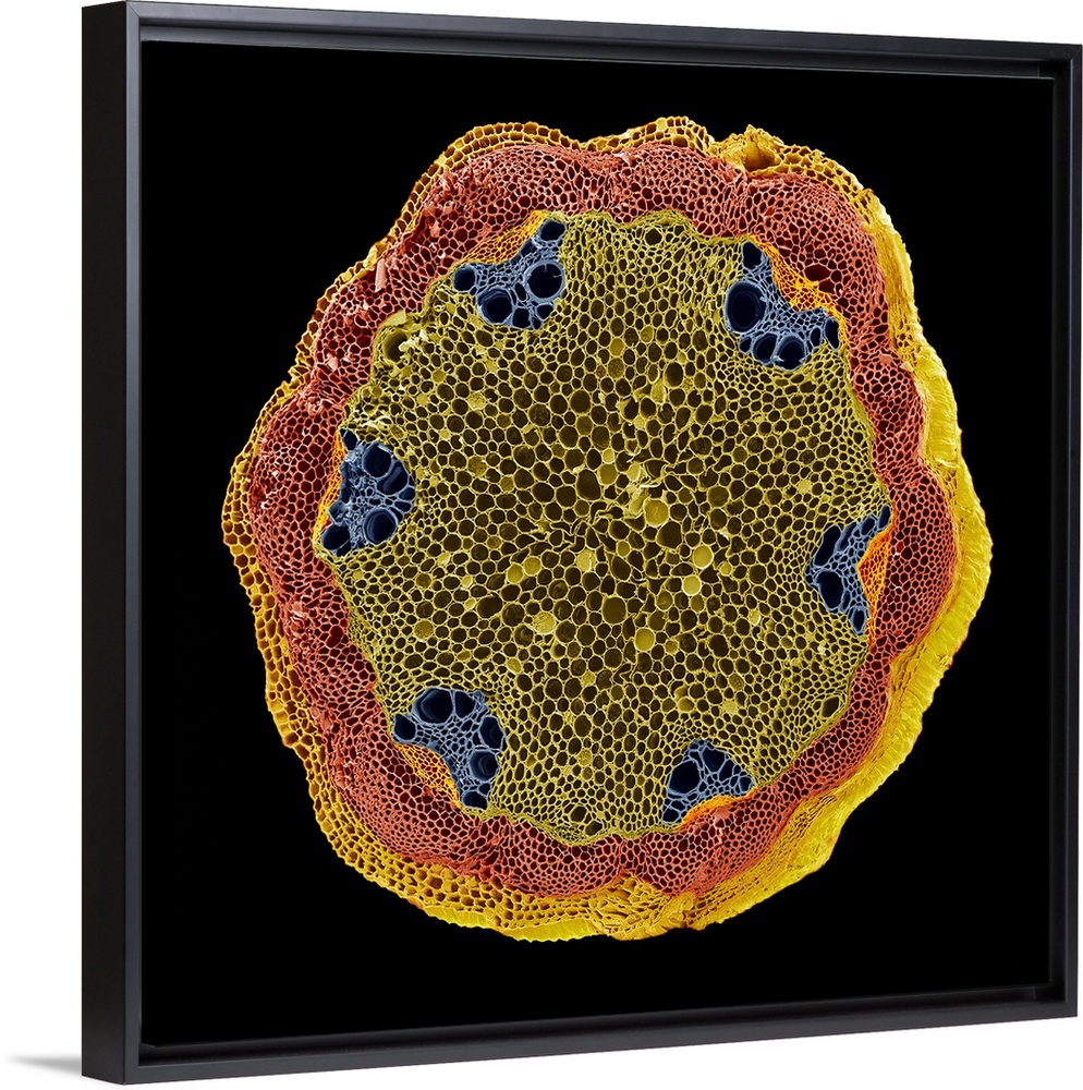 <p>Clematis stem. Coloured scanning electron micrograph (SEM) of a section through a Clematis sp. stem. Within the central pith (green) are six vascular bundles (blue and orange). Each vascular bundle consists of xylem (blue) and phloem (orange) tissue. Xylem transports water and mineral nutrients from the roots throughout the plant and phloem transports carbohydrates and plant hormones around the plant. Around the pith is the cortex (brown), which consists of parenchyma cells. On the outside of the stem is the epidermis (yellow).</p>