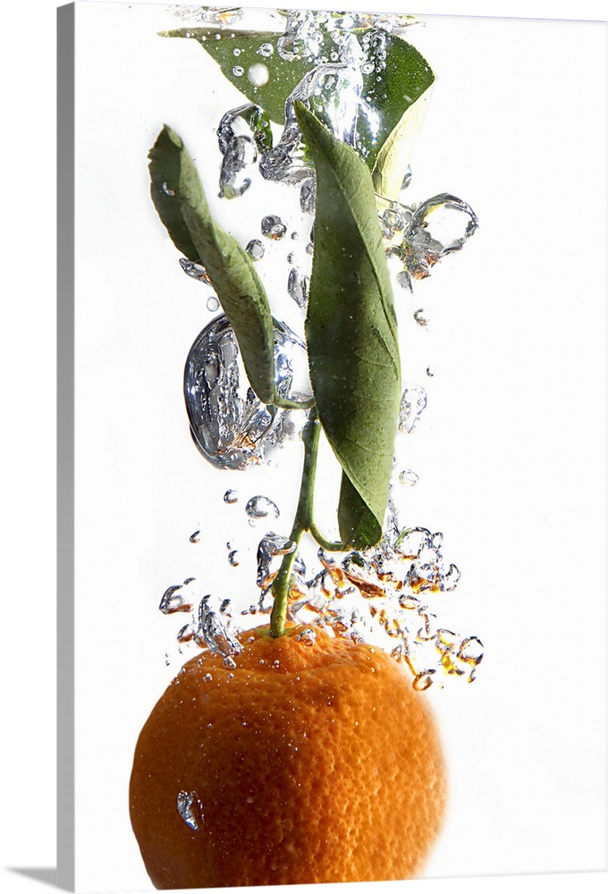 <p>Clementine in water with bubbles - showing water surface at top of shot.</p>