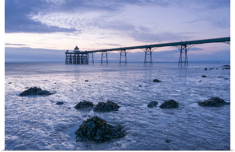 <p>Clevedon Pier in the Severn Estuary at low tide after sunset.</p>