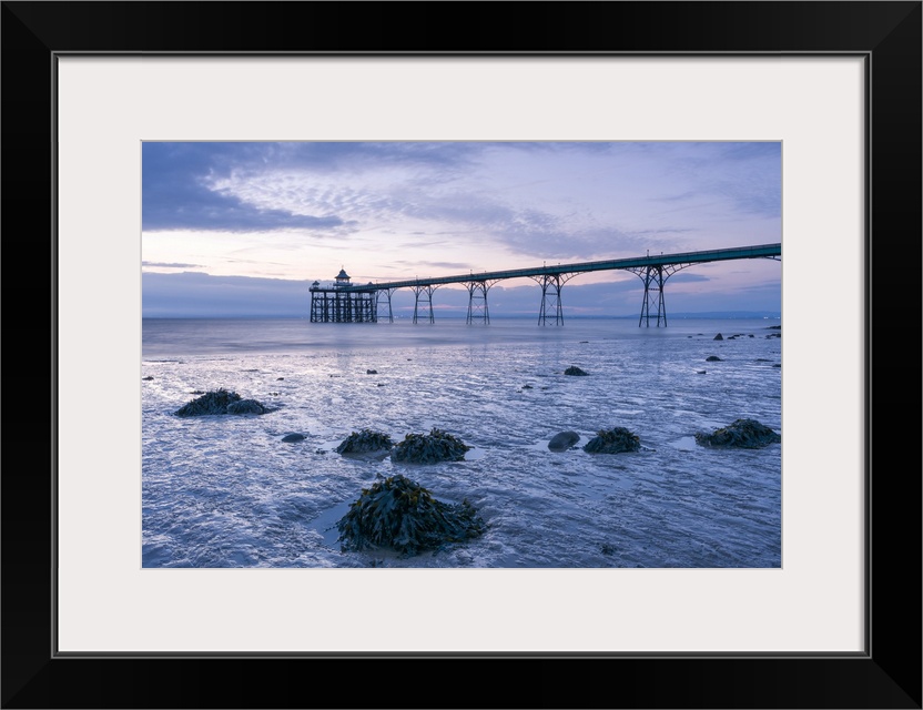 <p>Clevedon Pier in the Severn Estuary at low tide after sunset.</p>