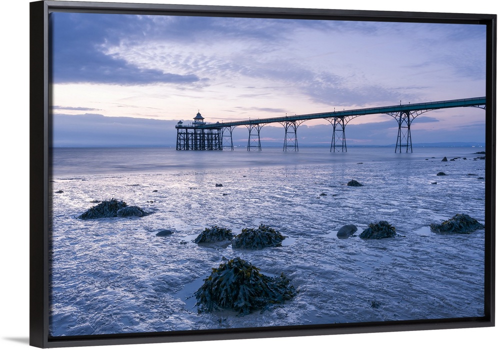 <p>Clevedon Pier in the Severn Estuary at low tide after sunset.</p>