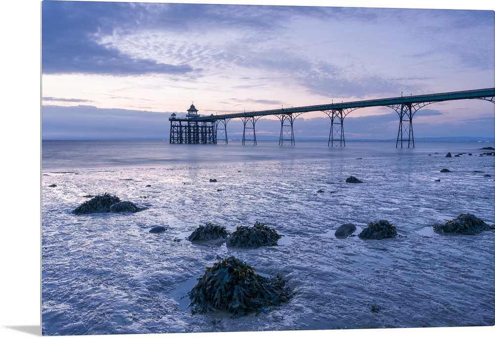<p>Clevedon Pier in the Severn Estuary at low tide after sunset.</p>
