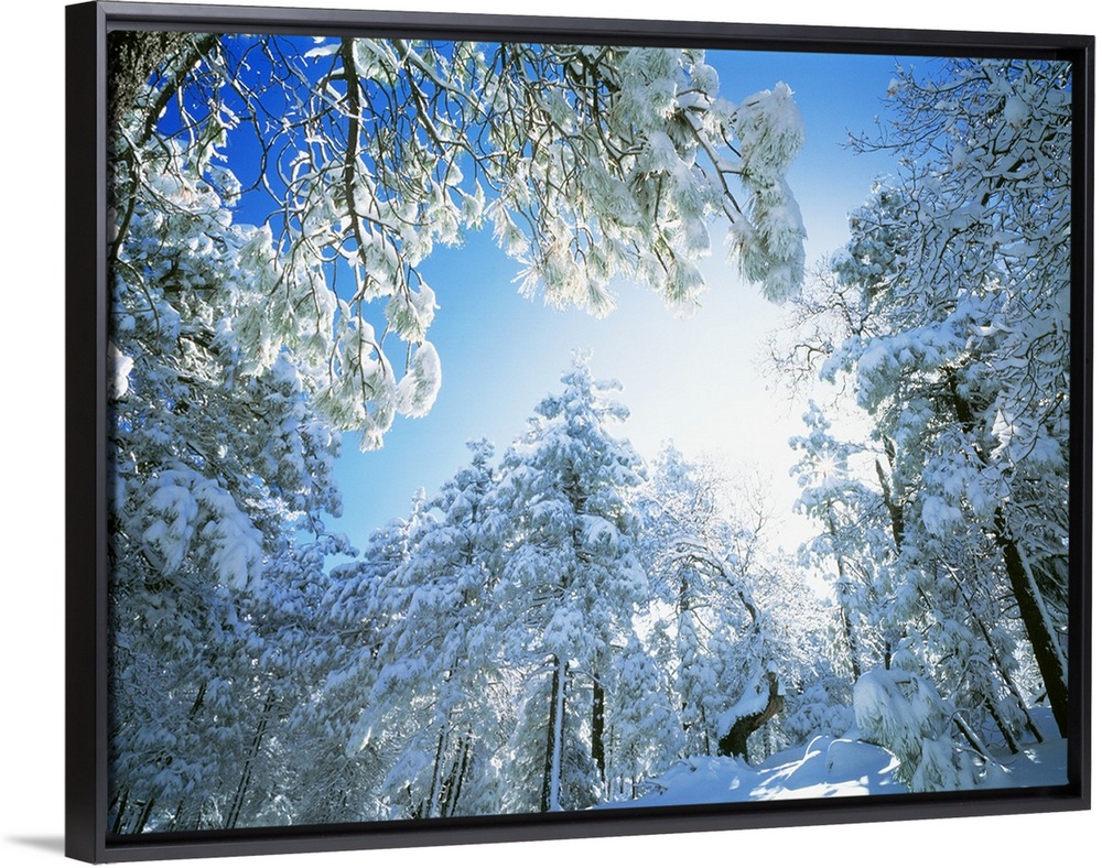 <p>Big photograph captured from ground level of a forest crowded with trees that have been covered with snow.</p>
