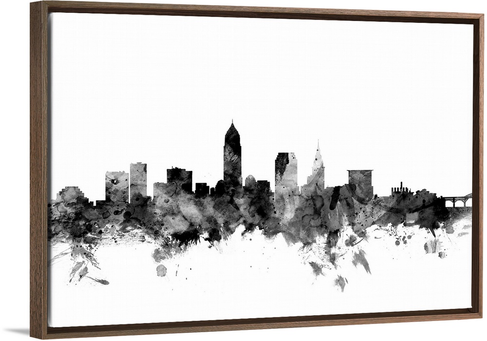 <p>Contemporary artwork of the Cleveland city skyline in black watercolor paint splashes.</p>