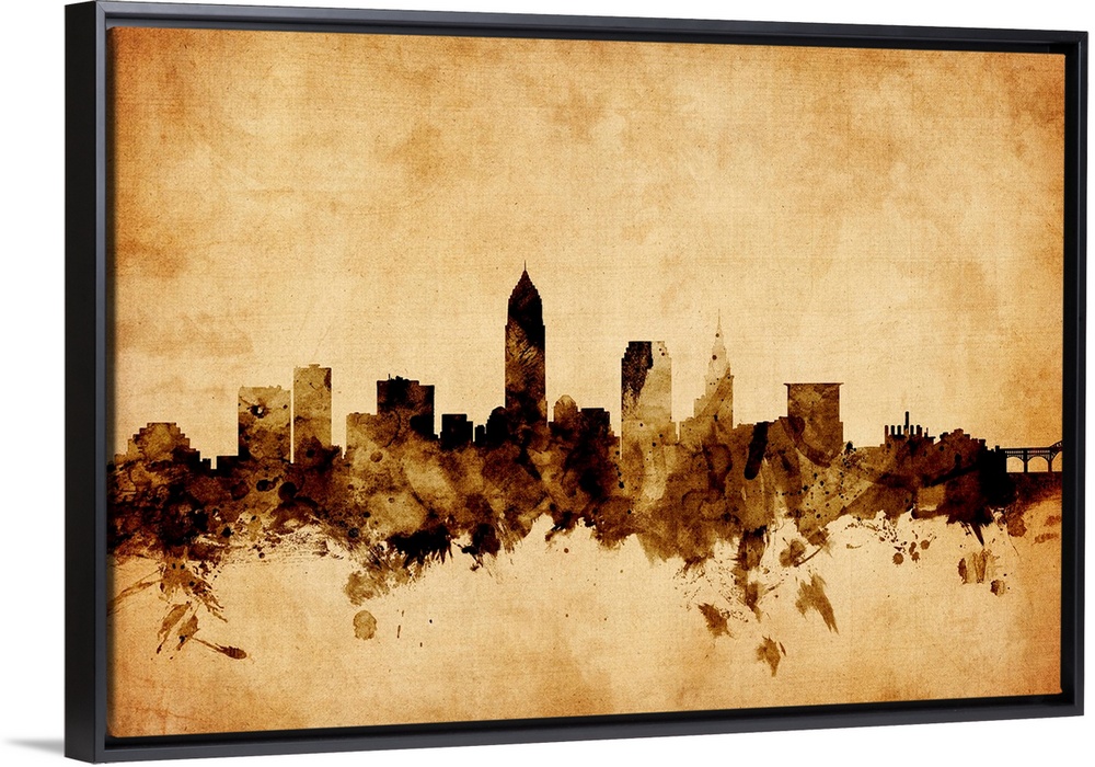 <p>Contemporary artwork of the Cleveland city skyline in a vintage distressed look.</p>