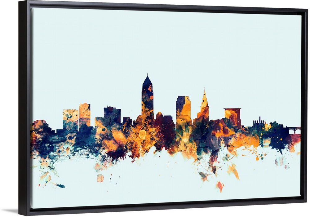 <p>Dark watercolor silhouette of the Cleveland city skyline against a light blue background.</p>