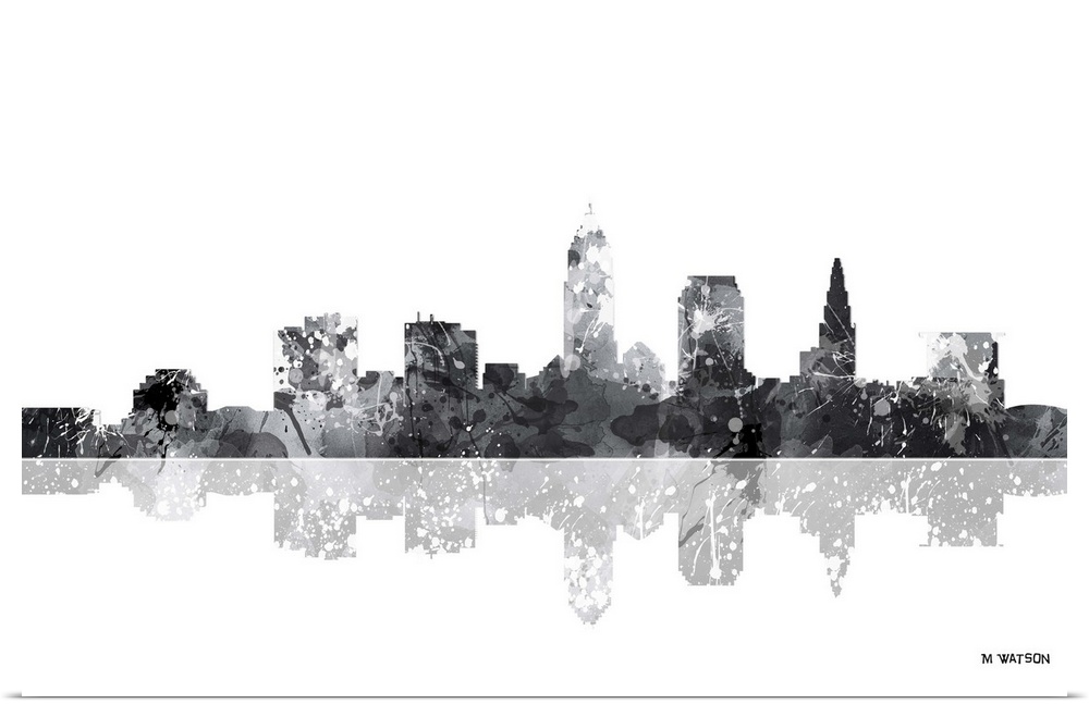 <p>Contemporary black and white watercolor skyline casting a mirror-like reflection below.</p>