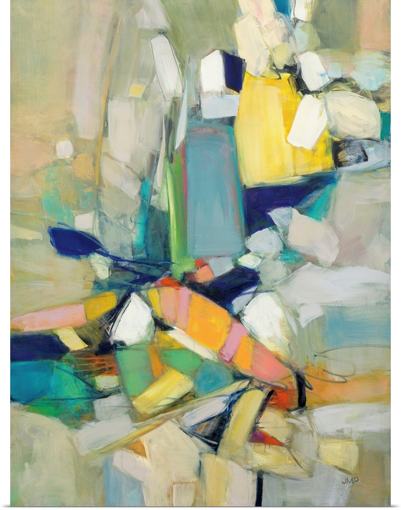 <p>A bright, cheerful contemporary abstract painting with organic blocks of color</p>