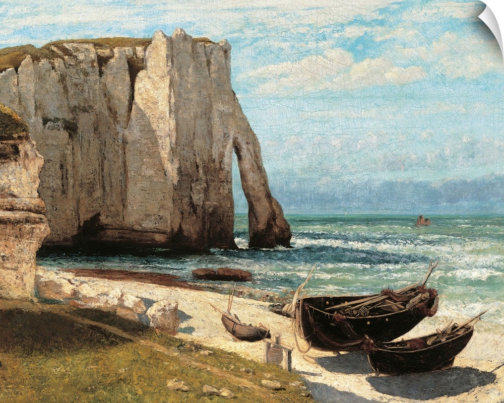 <p>The Cliff at Etretat after the Storm, by Gustave Courbet, 1870, 19th Century, oil on canvas, cm 133 x 162 - France, Ile de France, Paris, Muse dOrsay. Detail. Etretat Cliffs after the storm clouds sky light blue azure white sea beach boats waves rock clif</p>
