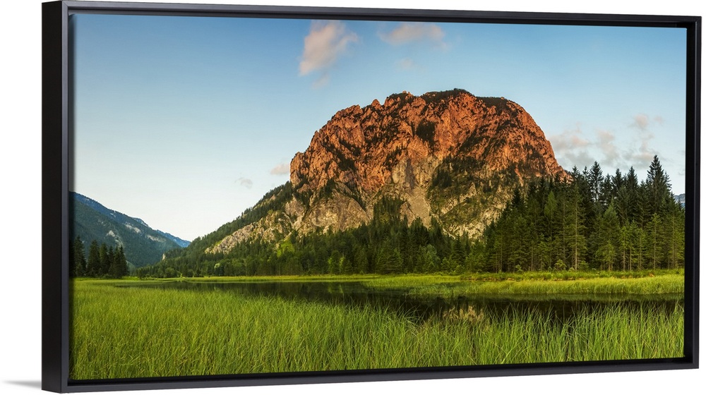 <p>Cliff face on alpine mountain being hit with a summer evening sun, overlooking a lake and forest; Wildaplen, Landl, Austria.</p>