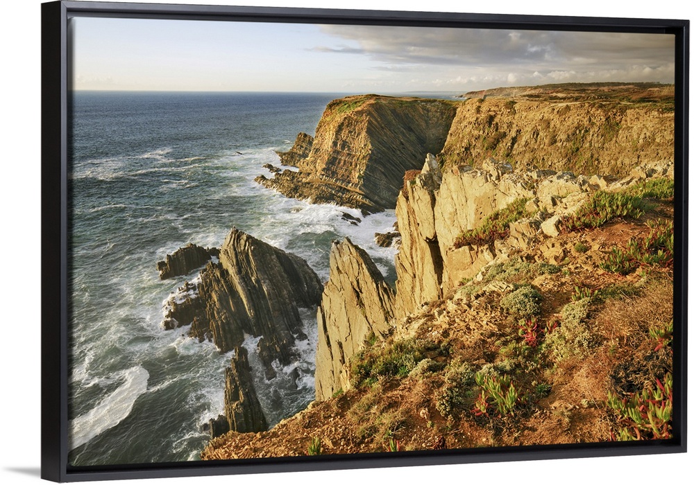 <p>Cliff landscape at Cabo Sardao. Portugal, Alentejo, Alentejo Litoral, Cabo Sardao. Parque Natural do Sudoeste Alentejano e Costa Vicentina. Alentejo, Western Europe, Portugal.</p>