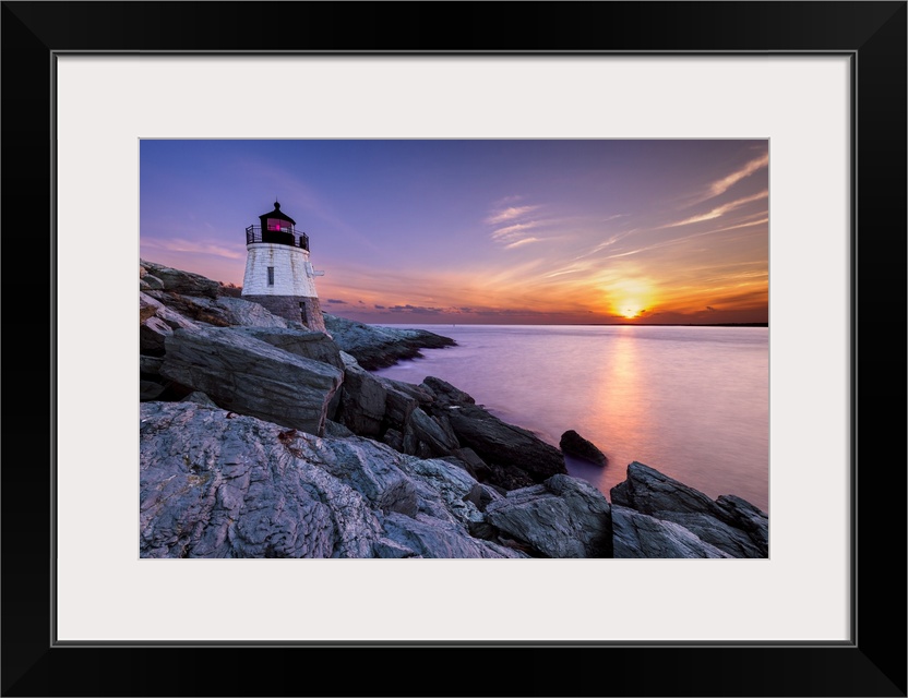 <p>Long exposure photograph of a lighthouse on a rocky cliff with a beautiful sunset over the water.</p>
